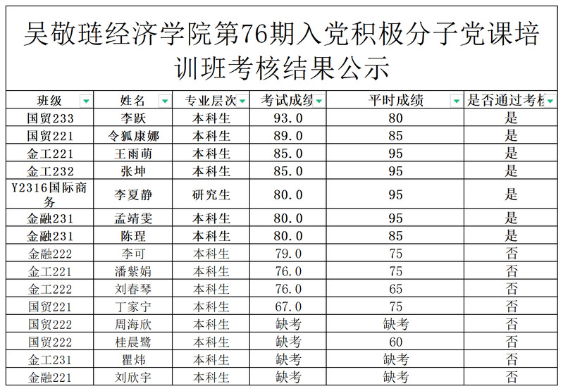 国产精品 第76期入党积极分子党课培训班考核结果公示