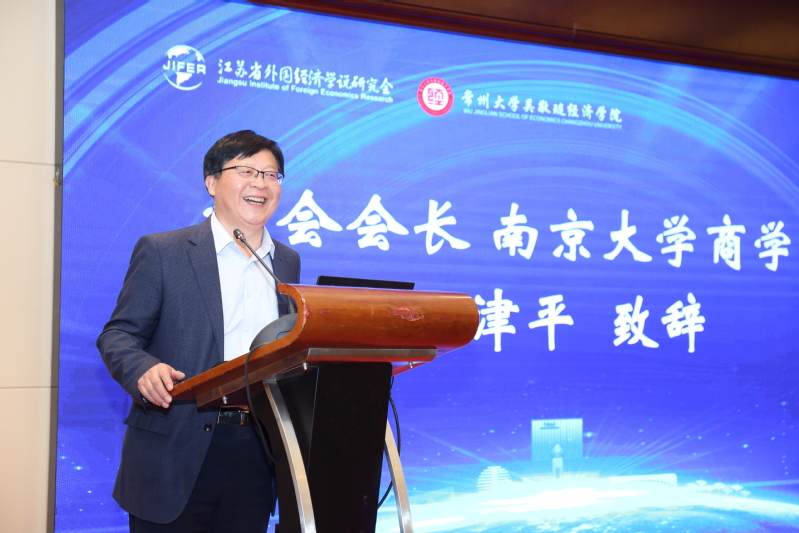 (图为学会会长、南京大学商国产精品 于津平教授致辞)